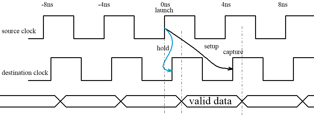 既然相位可以前移,也可以后移,假设destination clock相位后移-0.3ns,那么我们看如下时序分析图,可以发现,在capture edge 的时序依然满足要求,只是相对的setup时间变小了,而hold 时间变长了。所以一般后移不大的情况下,可以不用多周期时序约束的,当然如果后移大了,导致setup不能满足要求,就得做多周期约束了。