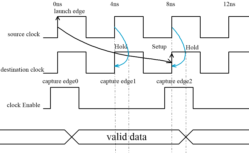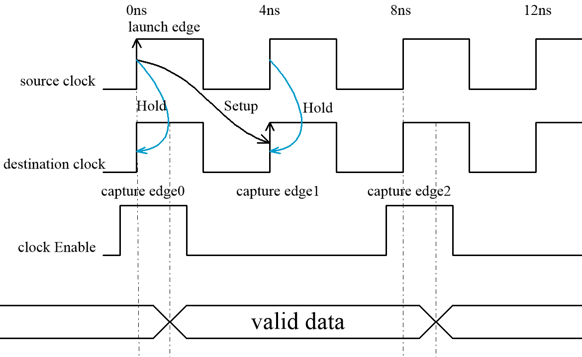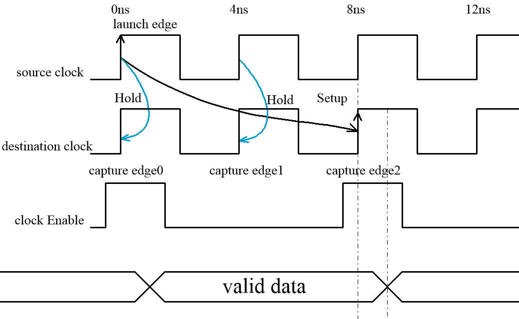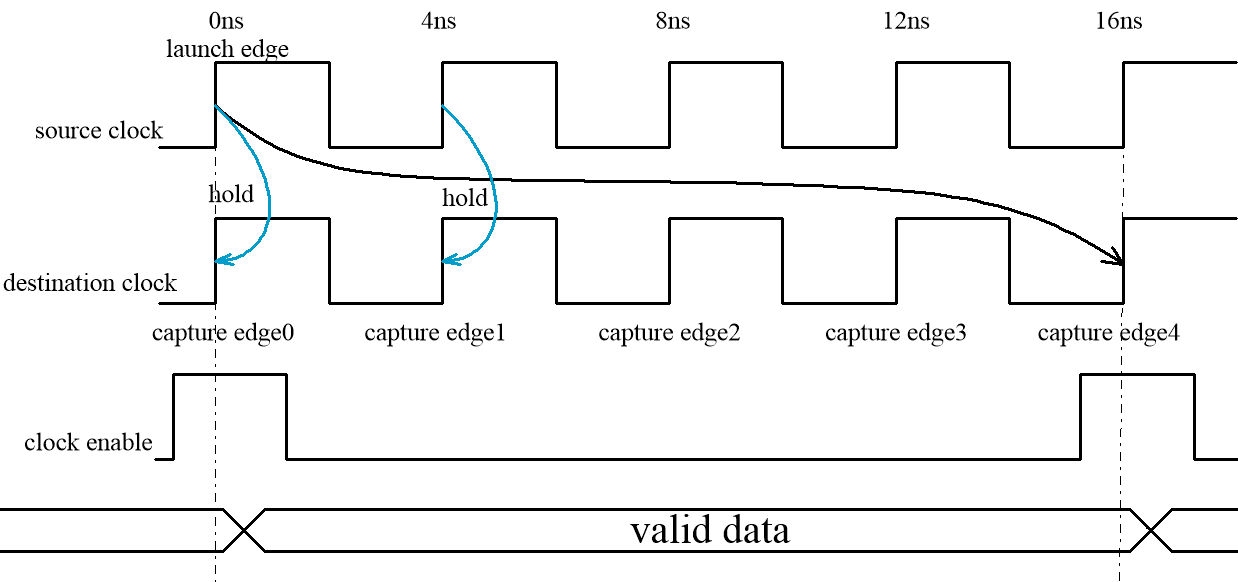 趁热打铁,假如CE 使能是每4个周期使能一次,那么setup 放宽到第4个capture edge,而hold依然放宽到destination clock的第一个edge,时序约束如下: