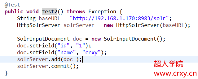 执行的时候发现报错,是因为缺少common-logging的包,添加对应的maven依赖 <dependency> <groupId>commons-logging</groupId> <artifactId>commons-logging</artifactId> <version>1.1.1</version> </dependency> 这样的话就可以把collection1这个索引库里面的数据打印出来了,因为查询条件是*:* 在这要注意这个baseurl,默认情况下,如果操作collection1里面的数据的话不需要指定就可以,默认就会操作collection1这个索引库。 所以上面的两个baseurl的效果是一样的。 索引index 使用add方法,可以向solr中添加一条数据。