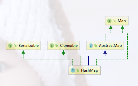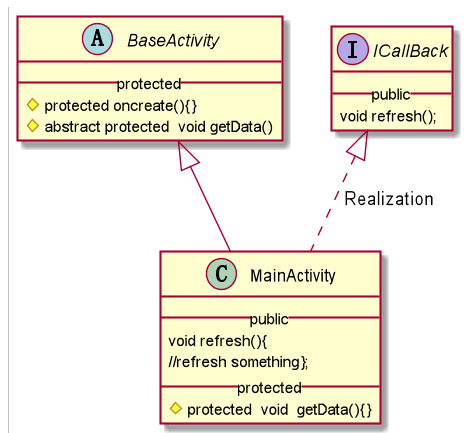 实现(Realization):在类图中就是接口和实现的关系。在UML类图中使用带三角箭头的虚线表示,箭头从实现类指向接口。如下图所示MainActivity实现了ICallBack这个接口: