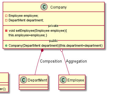 聚合(Aggregation):也是关联关系的特例,表示has-a关系,是一种不稳定的包含关系。较强于一般关联,有整体与局部的关系,并且没有了整体,局部也可单独存在。比如说员工和公司,员工可以独立存在,就算是公司倒闭了,员工还可以换工作。在类图使用空心的菱形表示,菱形与整体连接。如下UML类图所示:(注:聚合关系中作为成员变量的类一般使用set方法赋值)