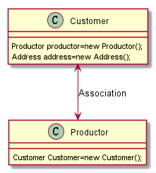 2.1.双向关联:默认情况下,关联是双向的。比如说顾客和购买的商品,顾客拥有商品,并且被购买的商品持有顾客。顾客和商品之间属于双向关联关系。在类图中使用两端带箭头的实线表,如下UML类图所示