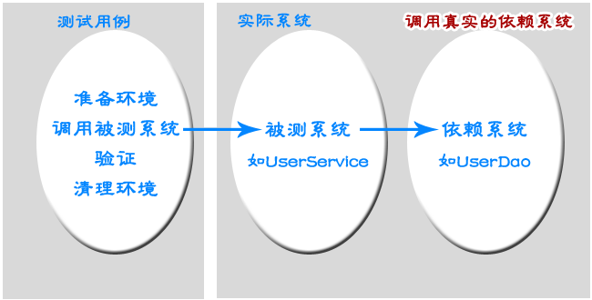 依赖系统:测试被测系统时,其依赖的部分,如UserDao;