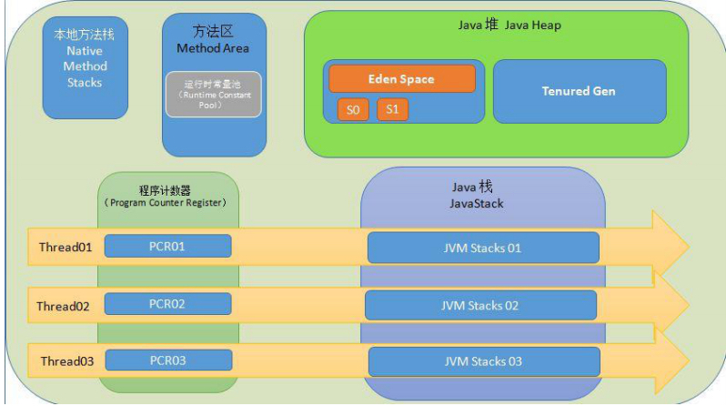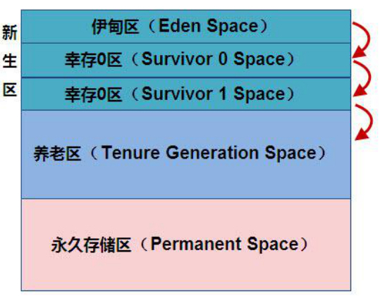 - 新生区是类的诞生、成长、消亡的区域, 一个类在这里产生、应用, 最后被垃圾回收器收集, 结束生命。新生区又分为两部分: 伊甸区(Eden space)和幸存者区(Survivor pace), 所有的类都是在伊甸区被new出来的。幸存区有两个: 0区(Survivor 0 space)和1区(Survivor 1 space)。当伊甸园的空间用完时, 程序又需要创建对象, JVM的垃圾回收器将对伊甸园进行垃圾回收(Minor GC),将伊甸园中的剩余对象移动到幸存0区。若幸存0区也满了,再对该区进行垃圾回收, 然后移动到1区。那如果1区也满了, 再移动到养老区, 若养老区也满了, 那么这个时候将产生Major GC(FullGC), 进行养老区的内存清理。若养老区执行Full GC之后发现依然无法进行对象的保存, 就会产生OOM异常“OutOfMemoryError”。