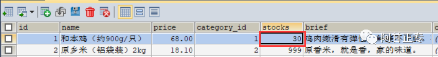 7、数据库product商品表数据如下,id=1的库存为30个,如下: