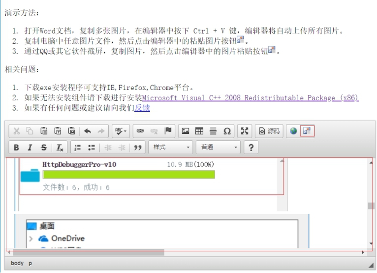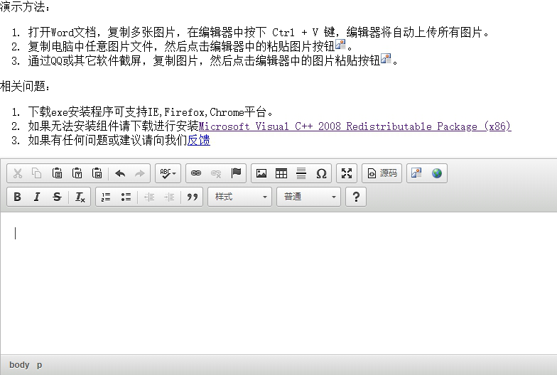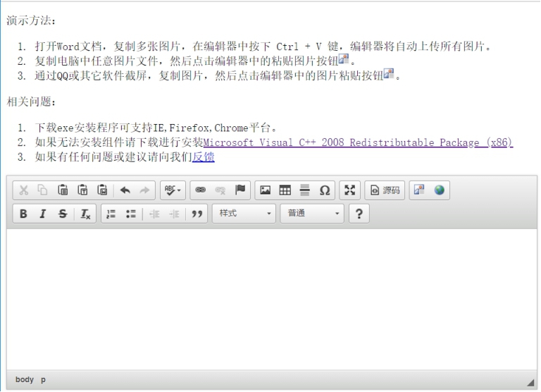 在网上查了很多资料,UEditor和其它的Web编辑器(富文本编辑器)在Chrome中可以支持单张图片粘贴。但是我们的用户需要处理的是Word中的图片和文字,一般情况下Word中的图片可能有十几张。有时候有几十张。特别是用户发一些教程或者使用说明类的文档时图片都是大几十张的。