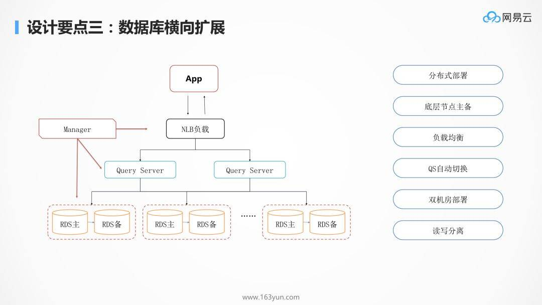 再往上就是横向怎么承载大的吞吐量的问题,上面有一个负载均衡 NLB,用 LVS,HAProxy, Keepalived,下面接了一层 Query Server。Query Server 是可以根据监控数据进行横向扩展的,如果出现了故障,可以随时进行替换的修复,对于业务层是没有任何感知的。