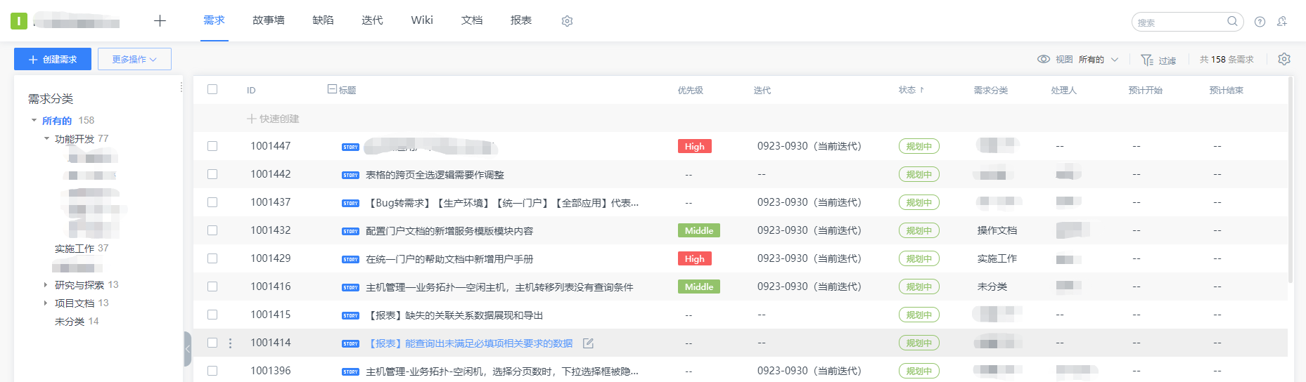 需求清单主要记录产品的功能需求、技术研究、以及非功能性需求等,通过需求分类进行归类管理,还可以通过子需求的方式对粗粒度的需求进行分解和细化,对优先级的设置对需求项进行排序,另外也可以自定义视图来筛选指定范围的需求项,主要界面如下: