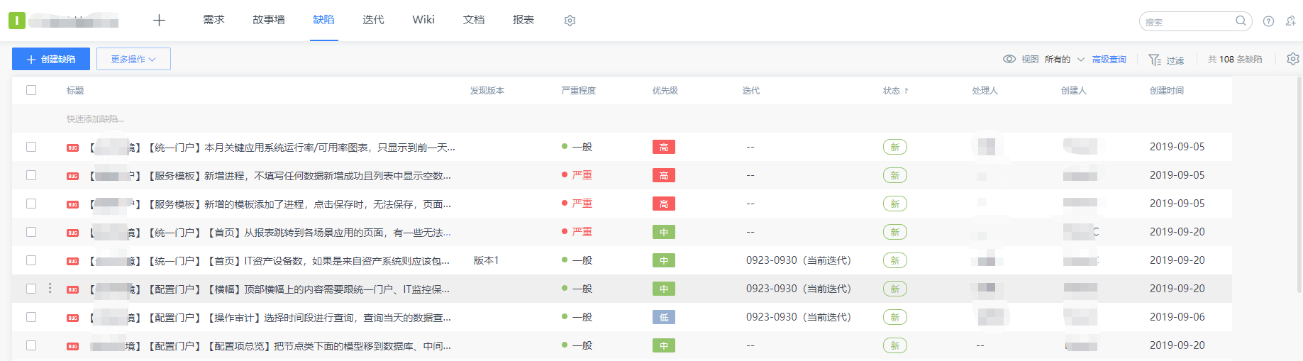 缺陷管理主要记录已实现产品功能bug等,通过定义缺陷的录入模板,明确缺陷的记录内容,包括问题描述、排查过程、解决方案等,同样可以定义视图筛选指定条件的缺陷清单等,界面如下: