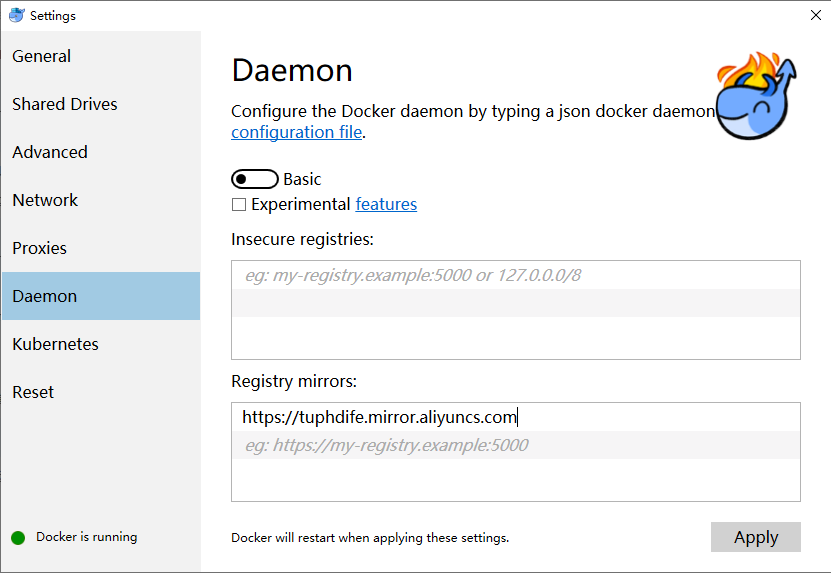 打开docker,右键Settings-->Daemon-->Registry mirrors复制刚才的专属加速器地址到此即可,这样就完成了国内镜像加速。