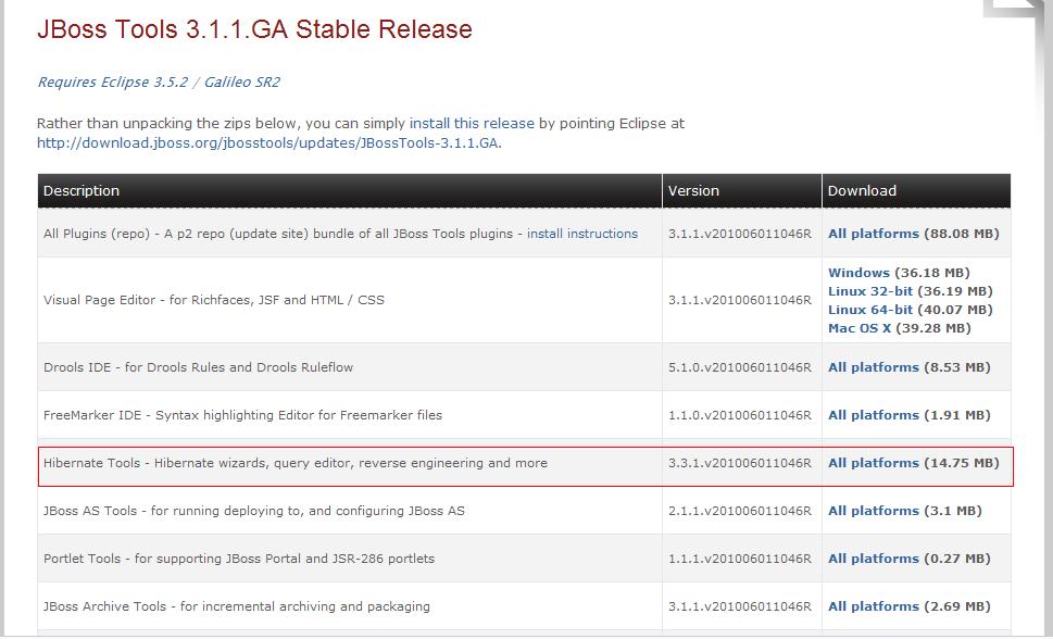 1、进入这个页面http://jboss.org/tools/download/stable/3_1_GA.htmlJBoss Tools 3.1.1.GA Stable Release这是当前最新版本下载地址,由于本人只是需要hibernate tools,这里就不下载其余的部分了。选择hibernate tools 14.75M 3.3.1.v201006011046R-H111-GA ,进行下载