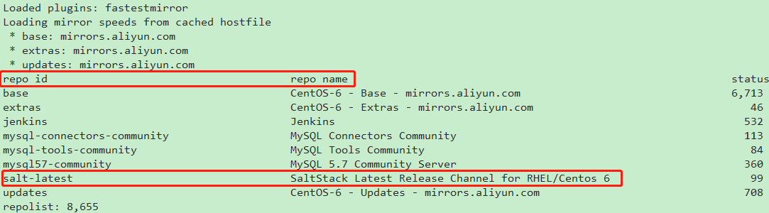命令 # yum install XXX --enablerepo=YYY XXX:需要要安装的软件。 YYY:相应源的“repo id”。 注意:建议安装的时候尽量选择同一个源,因为不同的源安装的软件可能会有冲突。 eg:指定当前某个repo源进行salt-minion的安装。 1.查看当前repo源的情况 # yum repolist 2.开始安装 # yum -y install salt-minion --enablerepo=salt-latest 来源:https://my.oschina.net/comics/blog/3129022 标签 Minion