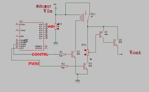 降压用的LM317,小电流应用应该够了。没时间去买开关管,就用的9013开关。