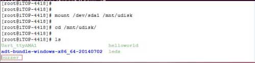 将可执行文件 buzzer 拷贝到 U 盘,启动开发板,插上 u 盘,输入挂载命令“mount