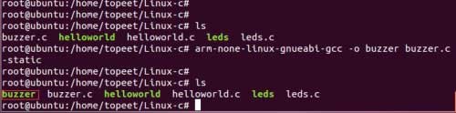 “arm-none-linux-gnueabi-gcc -o buzzer buzzer.c -static”,生成 buzzer 可执行程序。