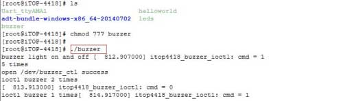 如下图所示,在超级终端中,输入“chmod 777 buzzer”修改权限,最后输入命令