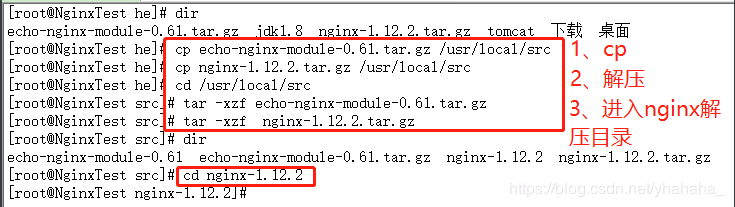 4. 将下载好的 nginx 和 echo-nginx-module 模块通过工具上传到虚拟机上,然后cp到 /usr/local/src 目录下,解压