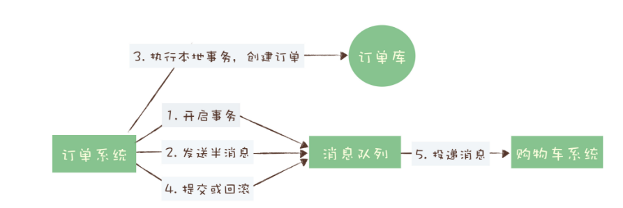 - 然后根据本地事务的执行结果决定提交或者回滚事务消息。如果订单创建成功,那就提交事务消息,购物车系统就可以消费到这条消息继续后续的流程。如果订单创建失败,那就回滚事务消息,购物车系统就不会收到这条消息。