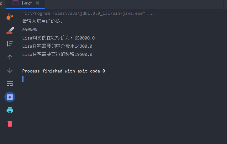 在Test类中定义购房对象——姓名Lisa,从控制台输入她计划买的房屋标价,如650000元。请你通过上面定义的接口和类,实现她通过中介买房的过程,显示需交纳的中介费和契税。
