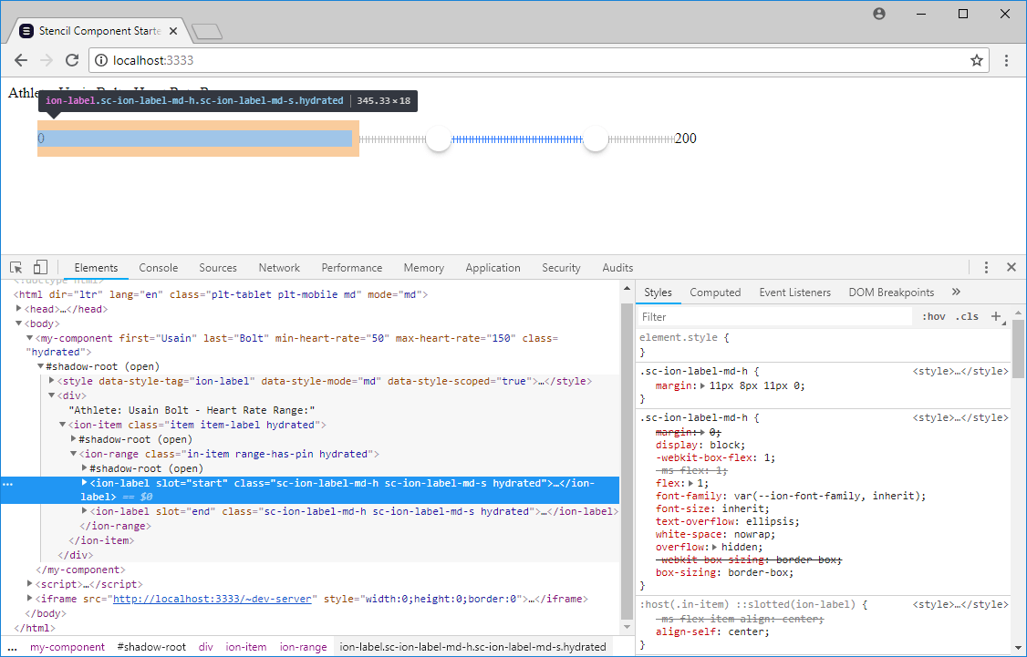 (Current time: 2018-08-26 19:20). Like 12 hours ago (check timestamp on the repo) the repository: https://github.com/napolev/stencil-ion-range/ on commit12c14b75cca92f19af6c5ccae60091319578cec7was generating almost properly the<ion-range/>tag above, except issues 1 and 2 (check image below). But now after a clean install of this repository it doesn't render what you see on the image below anymore. This is weird. After doing that commit I checked that after a clean install it rendered that.