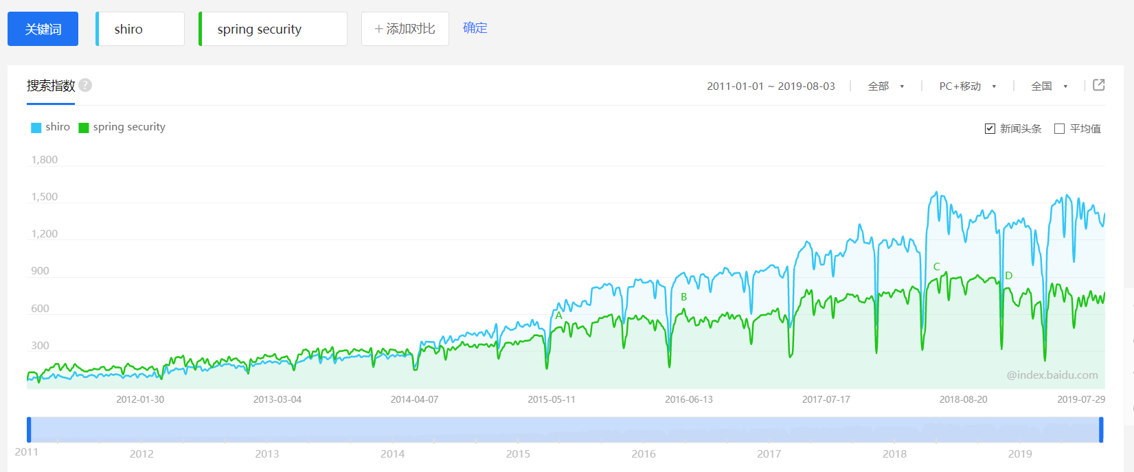 从使用情况上看,二者都在逐步提高使用量。shiro的使用量一直高于spring security.