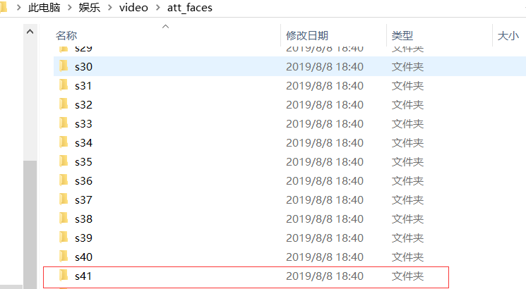 至此,我们就得到和ORL人脸数据库人脸大小一致的自己的人脸数据集(10张图片)。然后我们把自己的作为第41个人,在我们下载的人脸文件夹(att_faces)下建立一个s41的子文件夹,把自己的人脸数据放进去。就成了这样下面这样,最后一个文件夹里面是我自己的头像照片