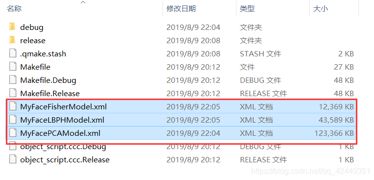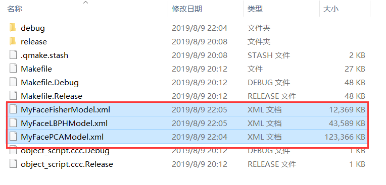 成功训练模型后,会生成三个xml文件,这三个xml文件对应的是不同的人脸识别方法