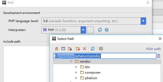 在Exteral Libraries上右键选择 Configure PHP Include Paths,然后添加Phalcon Developer Tools工具的目录入下: