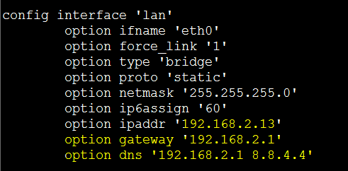 root@OpenWrt :~# uci set network.lan.ipaddr=192.168.2.13 # ip 可以依据自己的需要进行修改