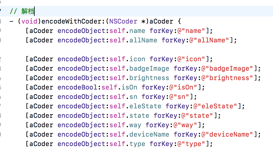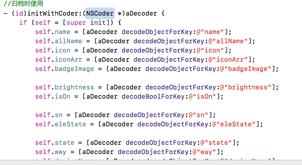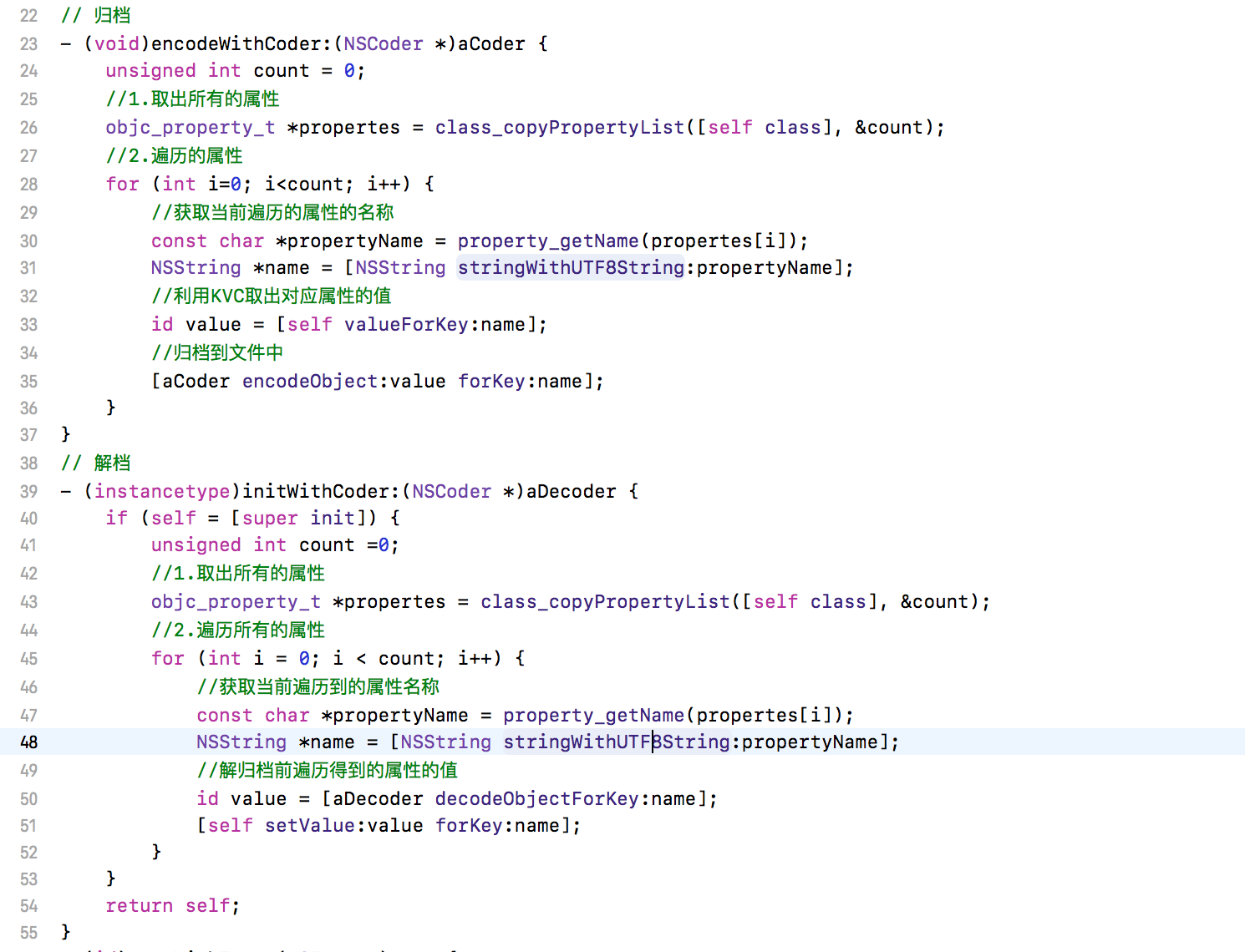 这样写的好处是不管有多少属性, 这两个方法都能通过runtime获取所有属性存取解决, 以后再添加任何属性都不用担心NSCoding协议方法会有问题啦