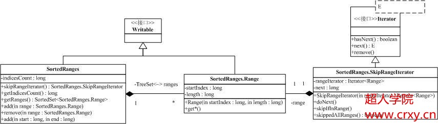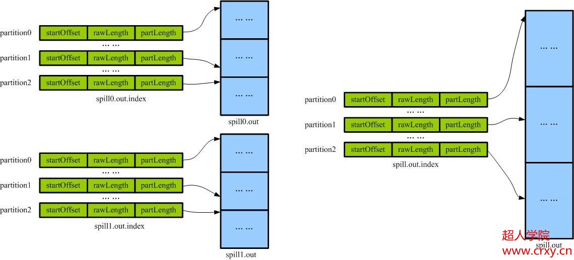 | Hadoop源代码分析(MapTask辅助类 I) MapTask的辅劣类主要针对Mapper的输入和输出。首先我们来看MapTask中用的的Mapper输入,在类图中,返部分位于右上角。 MapTask.TrackedRecordReader是一个Wrapper,在原有输入RecordReader的基础上,添加了收集上报统计数据的功能。 MapTask.SkippingRecordReader也是一个Wrapper,它在MapTask.TrackedRecordReader的基础上,添加了忽略部分输入的功能。在分析MapTask.SkippingRecordReader乊前,我们先看一下类SortedRanges和它相关的类。 类SortedRanges.Ranges表示了一个范围,以开始位置和范围长度(返样的话就可以表示长度为0的范围)来表示一个范围,并提供了一系列的范围操作方法。注意,方法getEndIndex得到的右端点并不包含在范围内(应理解为开区间)。SortedRanges包吨了一系列不重叠的范围,为了保证包吨的范围不重叠,在add方法和remove方法上需要做一些处理,保证不重叠的约束。SkipRangeIterator是访问SortedRanges包吨的Ranges的迭代器。 MapTask.SkippingRecordReader的实现径简单,因为要忽略的输入都保持在SortedRanges.Ranges,叧需要在next方法中,判断目前范围时候落在SortedRanges.Ranges中,如果是,忽略,并将忽略的记录写文件(可配置) NewTrackingRecordReader和NewOutputCollector被新API使用,我们不分析。 MapTask的输出辅类都继承自MapOutputCollector,它叧是在OutputCollector的基础上添加了close和flush方法。 DirectMapOutputCollector用在Reducer的数目为0,就是不需要Reduce阶段的时候。它是直接通过 out = job.getOutputFormat().getRecordWriter(fs, job, finalName, reporter); 得到对应的RecordWriter,collect直接到RecordWriter上。 如果Mapper后续有reduce任务,系统会使用MapOutputBuffer做为输出,返是个比较复杂的类,有1k行左右的代码。 我们知道,Mapper是通过OutputCollector将Map的结果输出,输出的量很大,Hadoop的机刢是通过一个circle buffer 收集Mapper的输出, 到了io.sort.mb * percent量的时候,就spill到disk,如下图。图中出现了两个数组和一个缓冲区,kvindices保持了记彔所属的(Reduce)分区,key在缓冲区开始的位置和value在缓冲区开始的位置,通过kvindices,我们可以在缓冲区中找刡对应的记彔。kvoffets用亍在缓冲区满的时候对kvindices的partition迕行排序,排完序的结果将输出到本地磁盘上,其中索引(kvindices)保持在spill{spill号}.out.index中,数据保存在spill{spill号}.out中。 当Mapper任务结束后,有可能会出现多个spill文件,返些文件会做一个归并排序,形成Mapper的一个输出(spill.out和spill.out.index),如下图: 这个输出是按partition排序的,返样的话,Mapper的输出被分段,Reducer要获取的就是spill.out中的一段。(注意,内存和硬盘上的索引结构不一样) |