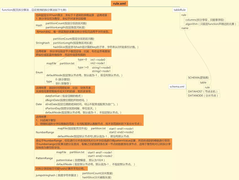 其中rule.xml是日常配置分片算法的时候最常用到的配置文件,我们通过思维导图的方式给大家整理了DBLE的rule.xml的配置,需要注意的是思维导图不能代替看文档,导图只能起着概括归纳的作用,详细的细节还请参考官方文档。