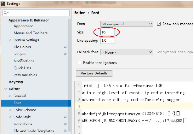 IDEA工具的默认字体非常小,代码编辑器和控制台的输出字体都需要进行调整。点击菜单栏上的 File->Settings->Editor->Font 修改字体。