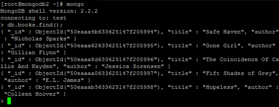 > db.books.save( { title: 'The Coincidence Of Callie And Kayden', author: 'Jessica Sorensen' } )