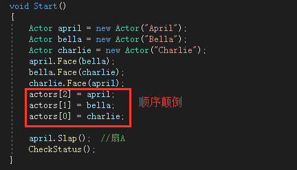 但是,如果我们换一下他们在主类里actors里的顺序,会发现输出的结果会发生错误,有的演员会再被扇的同一帧做出反应,有的演员会再被扇的下一帧做出反馈。