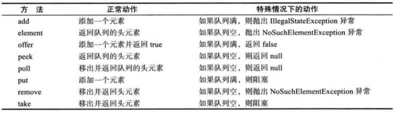 - 当试图向满的队列中添加或从空的队列 中移出元素时, add、 remove 和 element 操作抛出异常。