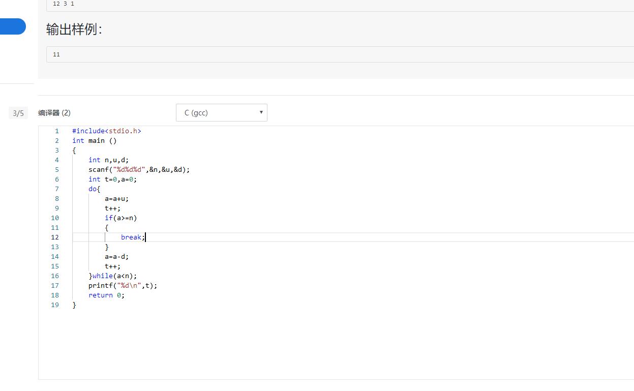 循环体为a+=u,t++, if(a>n)跳出循环,a-=d,t++;当a>n是跳出循环。
