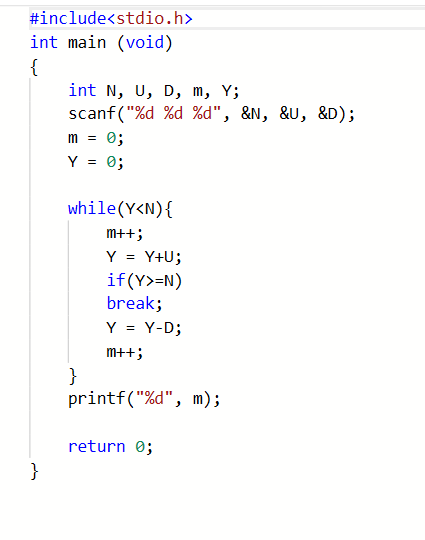 一条蠕虫长1寸,在一口深为N寸的井的底部。已知蠕虫每1分钟可以向上爬U寸,但必须休息1分钟才能接着往上爬。在休息的过程中,蠕虫又下滑了D寸。就这样,上爬和下滑重复进行。请问,蠕虫需要多长时间才能爬出井?