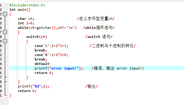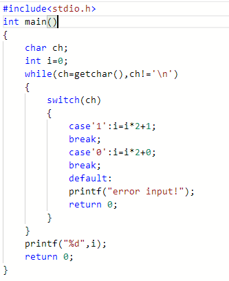 输入一组二进制字符,输出其对应的十进制数。当输入回车键时,输入结束。若输入非二进制字符,输出error input!