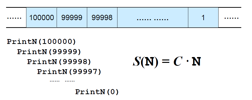 空间占用:首先会将100000存入内存,然后调用printN(99999);将99999存入内存,再调用printN(99998) ...