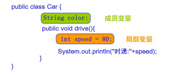 - 成员变量:和以前定义变量几乎是一样的。只不过位置发生了改变。在类中,方法外。