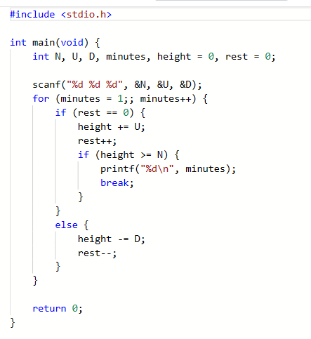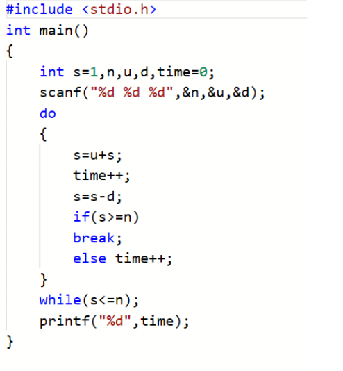 这里要求不足1分钟按1分钟计,并且假定只要在某次上爬过程中蠕虫的头部到达了井的顶部,那么蠕虫就完成任务了。初始时,蠕虫是趴在井底的(即高度为0)