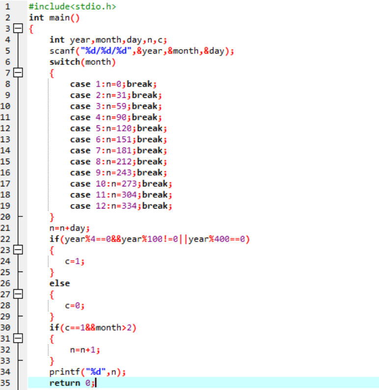 - 区别:这位同学利用了先判断是平年还是闰年再用两个swtich分支语句将闰年和平年分开编写,我的思路是先把日期输入,按照是平年的月份天数规律利用一个swtich分支语句累加月份天数,然后再判断年份是闰年还是平年,若是平年直接输出,若是闰年,在原来算出天数基础上+1。