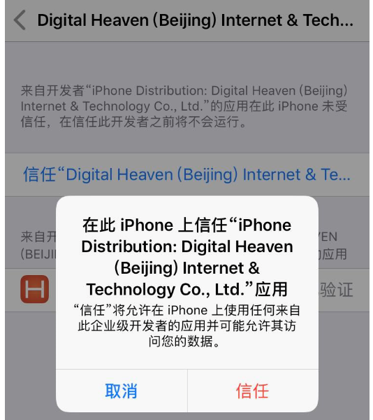 - 安装完基座后,在手机打开基座的时候,弹出为未受信任的企业级开发者,需要手动信任,打开设置->通用->描述文件与设备安装