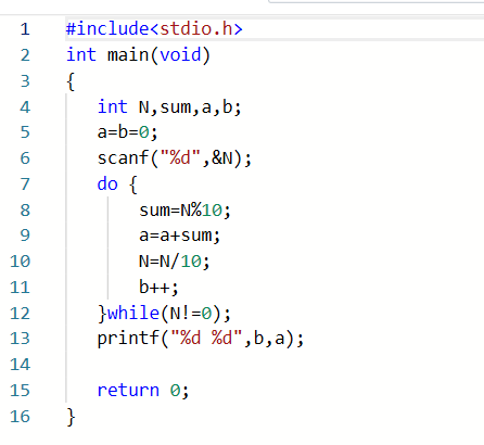 题目内容描述:对于给定的正整数N,求它的位数及其各位数字之和。