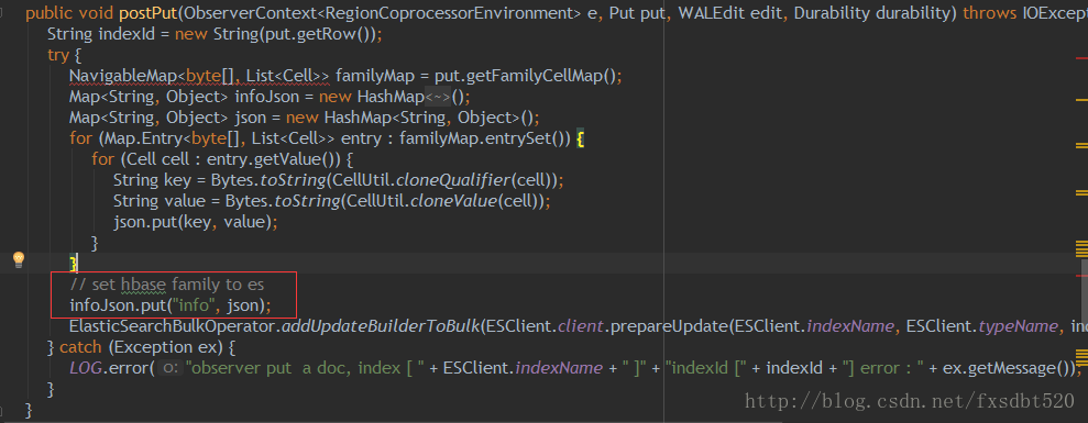 然后编写一个Class类,继承BaseRegionObserver,并复写其中的start()、stop()、postPut()、postDelete()、四个方法。这四个方法其实很好理解,分别表示协作器开始、协作器结束、put事件触发并将数据存入hbase之后我们可以做一些事情,delete事件触发并将数据从hbase删除之后我们可以做一些事情。我们只要将初始化ES客户端的代码写在start中,在stop中关闭ES客户端以及定义好的Scheduled对象即可。两个触发事件分别bulk hbase中的数据到ES,就轻轻松松的搞定了。