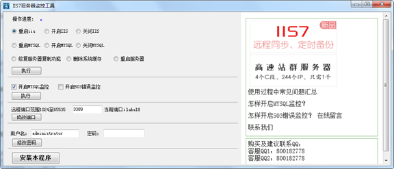 IIS7服务器监控工具该软件风格简约,操作简单,删除系统缓存,重启服务器,修改服务器账号密码,修复服务器复制功能等,也可以一键开启关闭MYSQL和503错误的监控,省去了繁琐的操作步骤,一键完成。也可以直接修改远程端口范围,省去繁琐步骤。