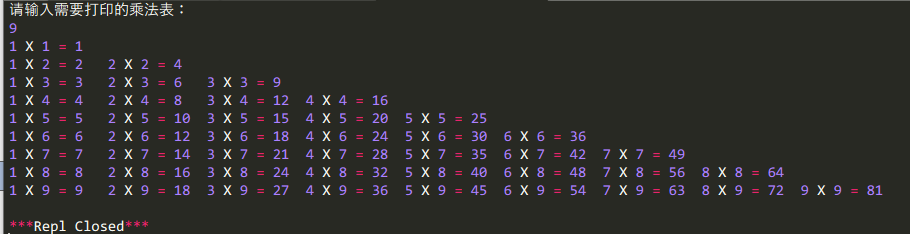 17 print("%d X %d = %d" % (col, row1, col * row1), end = '\t') # 输出显示的内容,列数乘以行数等于结果,end功能使打印结束后不会自动换行