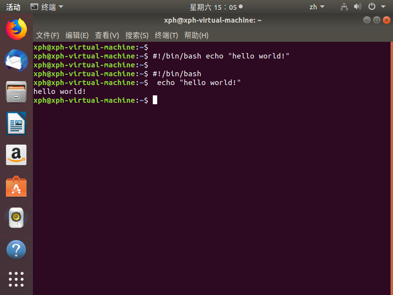 如图终端会显示最终的结果“hello world!”,这是简单的shell脚本编辑命令。