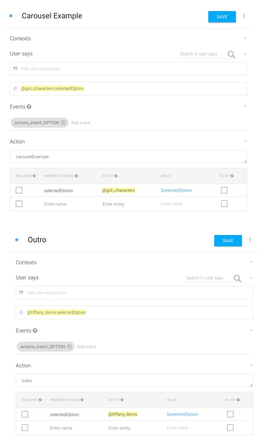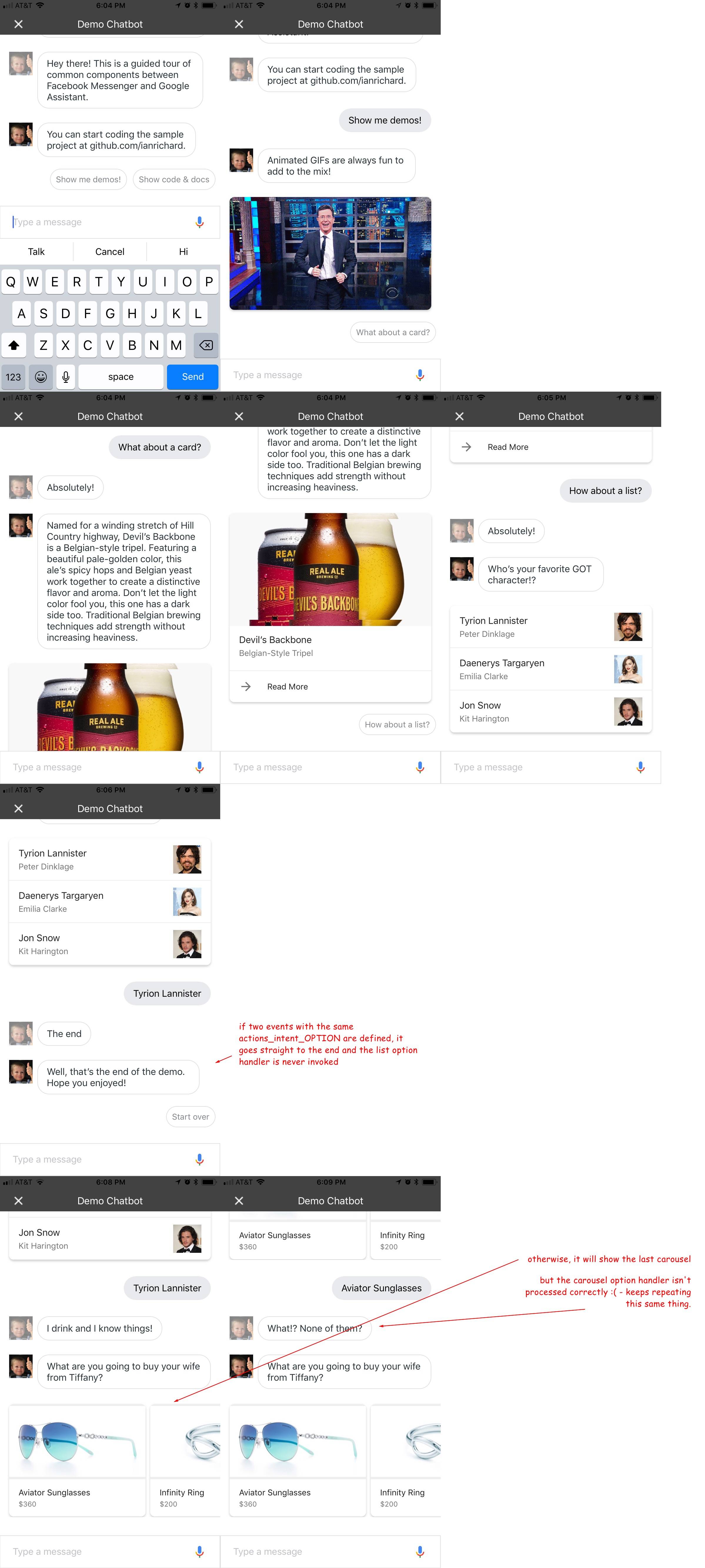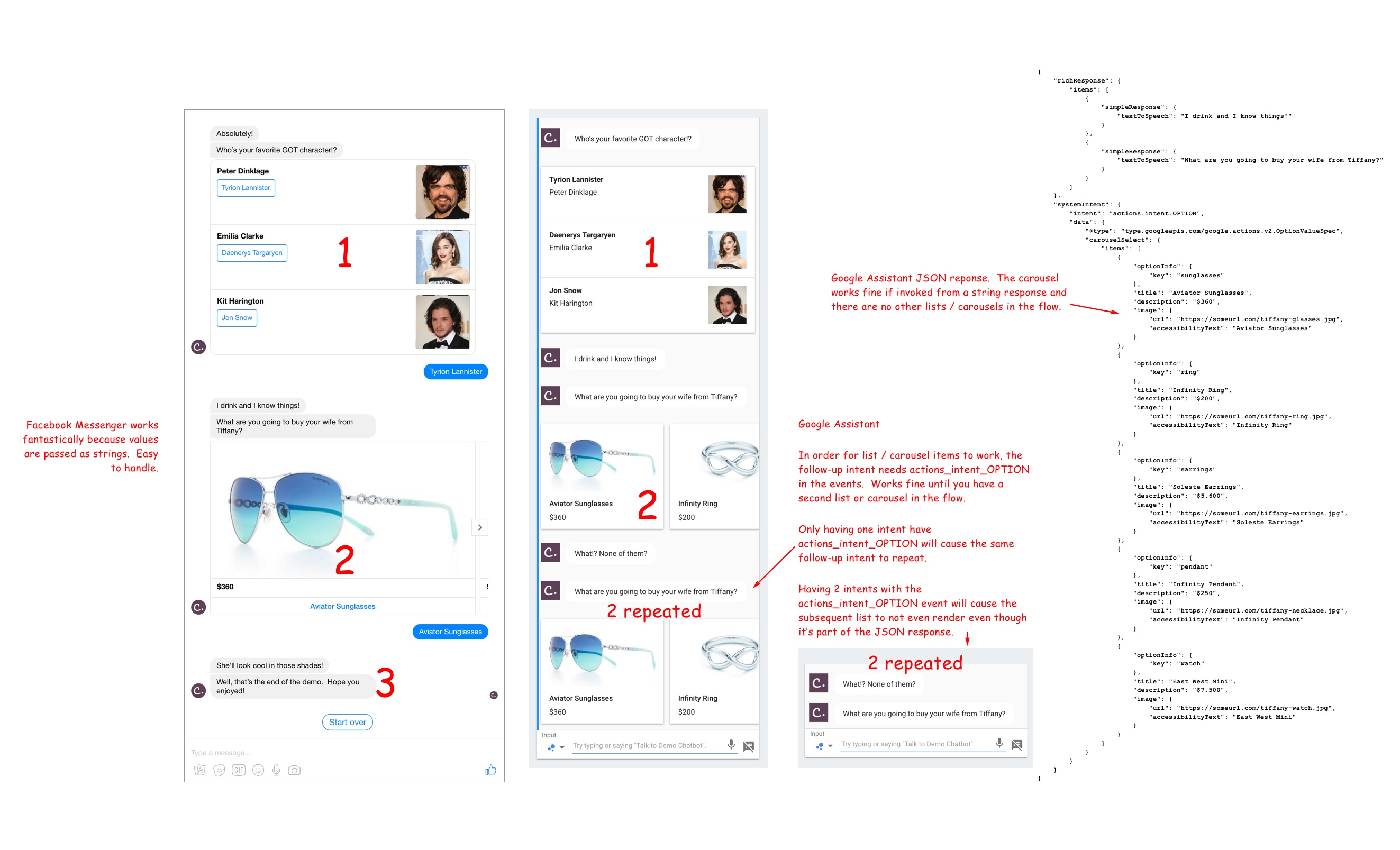 I have webhooks configured through Dialogflow for a template chatbot UI starter project I'm making on Github. I have a bot integrated through Facebook Messenger and Google Assistant. All of Facebook works fine because the actions send back strings and it's easy to handle. But when Google Assistant tries to handle items of "@type": "type.googleapis.com/google.actions.v2.OptionValueSpec", actions_intent_OPTION is needed on the event in Dialogflow to handle the response. If I have just one in my app, it works fine, but when I add a second list item / carousel item of type OptionValueSpec, the flow chokes. I have details on the attached image. My guess is actions_intent_OPTION is needed to handle the list, but when I put that on multiple intents on the events section, the flow doesn't know how to handle it.